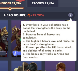 レベル150突破で出る征服の1章に1500個、レベル250突破で出る2章に1700個使って、残りはエピック宝箱10連の3000個で使うのが良さそう。……だと思ってレベル900まで引いてたけど、ヒーローボーナスの補正が兵舎の出撃画面の戦闘力には反映されてるのに説明にはアリーナとボス以外乗らないって書いてあるのに気づいたのでルーレットに変更した。一応確認したけど1.4%上げて結果何も変わらなかったので書いてある通り意味なさそう。仮にあってもほぼ変わらないのでゴミかな。