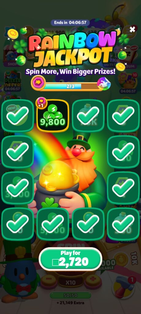 さてまず肝心のゲームのほうですが、ゲームはCoin MasterとかMONOPOLY GO!と似たような感じの釣りバージョンになります。問題はバランスが相当渋いことです。課金してスピン数を無理やり手に入れてそれをできるだけ消耗しないようにしないとすぐスピン数がなくなります。やることは至って簡単で、課金アイテムやイベントと相談しながらただ回すだけなのですが、どこまで報酬取り切れそうかとか相当センスが必要になるので、類似ゲームを経験したことがないと難しいです。スピン数が足りなくて報酬に届かなかったりすると追加で課金するかそこでおしまいみたいなことになります。