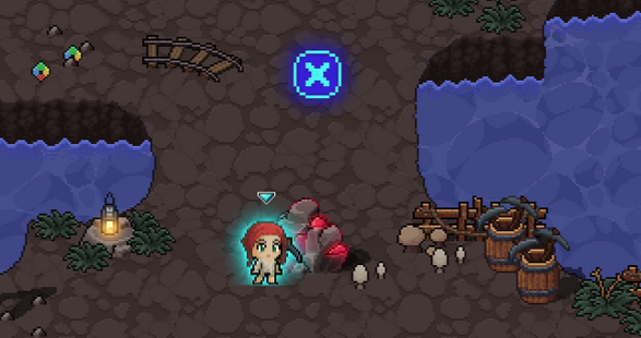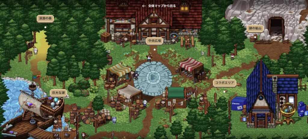 - 北西の深淵の森では戦闘、南西の巨大な湖で釣り、北東の謎の鉱山で採掘が行えます。中央でベビーゴーレムのところに飛べます。