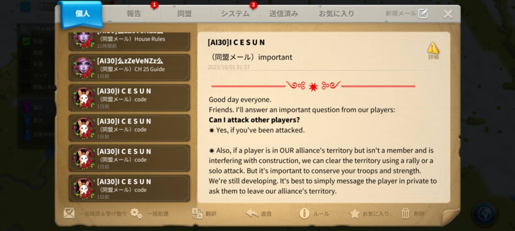 1つ目の同盟は採集タイル絶対殺すマンが巡回していたので採集自体が不可能な状態になり、10日目くらいに他のポイ活ギルドに移籍したのですが、そこでも採集中に焼かれたのでなんだこのクソゲー!?と思いながらやっていました