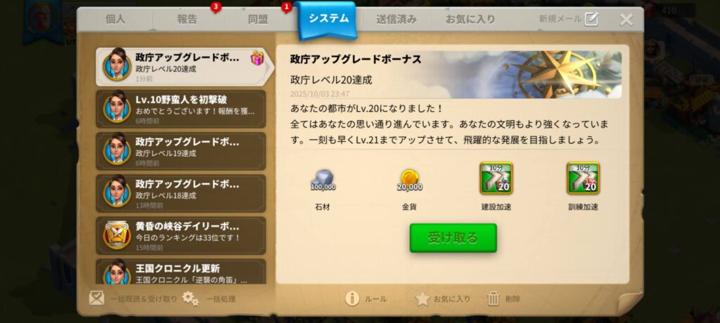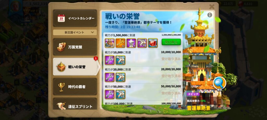 斥候キャンプが11で3人になるのでここまで一気に上げます。ギフトコード入れたりして、政庁7まであげて宝石月間カードを半額の610円にして買って全力で上げます。これは野蛮人自動で狩れるのが天才です。ついでになんかいっぱい貰えるので370円のデイリーパックも買いました。霧? 霧は頑張って晴らす、ただそれだけ。なんで自動に時間制限つけてんだよ……