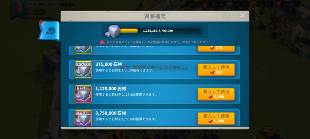 こういうそのレベルを境にですね世界が変わる節目までは急いであげる価値がありますね。ということで、ここもマッハで目指したわけですが、お前唐突に歩兵16とか要求してくんなや、クソ病院16。油断してちょっとロス。結局370円のデイリーパックを追加で2回買ったので、合計課金額は1720円だった。